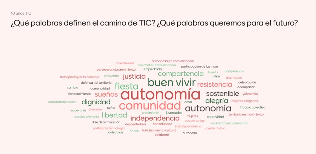 - Durante la charla online se organizó una dinámica grupal con las personas que siguieron la transmisión para construir una nube de palabras respondiendo a las preguntas ¿Qué palabras definen el camino de TIC? ¿Qué palabras queremos para el futuro? generando así una conceptualización colectiva que tiene la intención de ser brújula para guiar los siguientes pasos de la organización. ↩︎