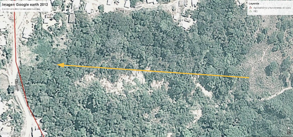 Posteriormente, al utilizar la aplicación Google Earth pudimos notar, a través de las imágenes satelitales, la afectación real del área siniestrada y con mayor riesgo para las viviendas cercanas, como se muestra en las siguientes imágenes.