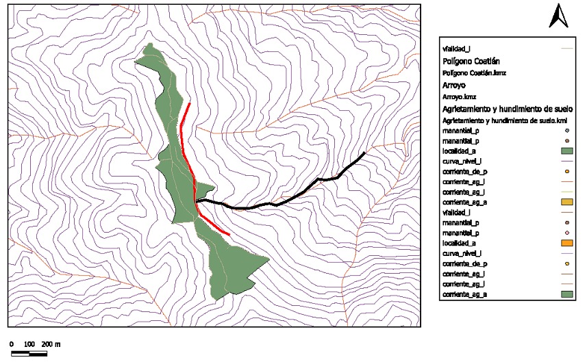 La línea negra representa el hundimiento y su avance principal; la línea roja gruesa representa un agrietamiento que pasa a la orilla de la comunidad; y la parte verde corresponde a la zona poblada.